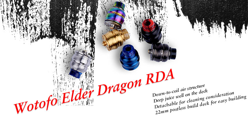 The Wotofo Elder Dragon RDA is 22mm diameter atomizer designed by Wotofo and Japanese YouTube reviewer, and is named Ryujin (the dragon god) for Japan Edition. It features a compact pagoda shape in appearance. The 22mm postless build deck allows different coil directions, making coil installing easy and intuitive. The down-to-coil air structure is used on the build deck, enhancing vaporizing performance and flavor delivery. 6 colors are available.