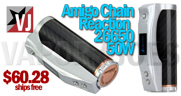 Here’s a stupendous deal on a mod that is being touted as a winner… it’s the Amigo Chain Reaction 50W Mod. The Amigo is a carbon fibre tube that houses a 26650 battery, with a stainless steel handle piece that houses all the electronics. The three button interface makes adjustments simple. Contacts are copper for great continuity. It offers a range of 7 to 50 watts, and is ideally suited to moderate builds or any of the new subohm tanks as it is capable of firing down to 0.3 ohms, but performs the best at 0.5 ohms or more. It even comes with a tool to assist you in adjusting the contact pin. Did we mention it looks terrific?