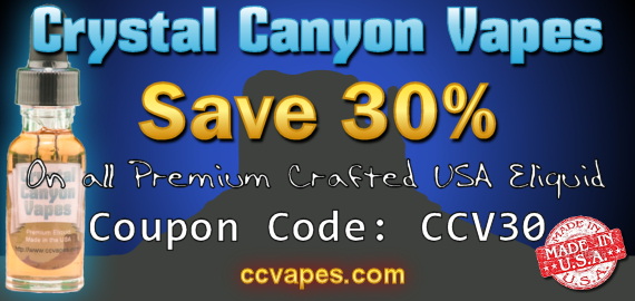 30% Savings on all hand crafted premium ‎eliquid‬ from Crystal Canyon Vapes! Use coupon code CCV30