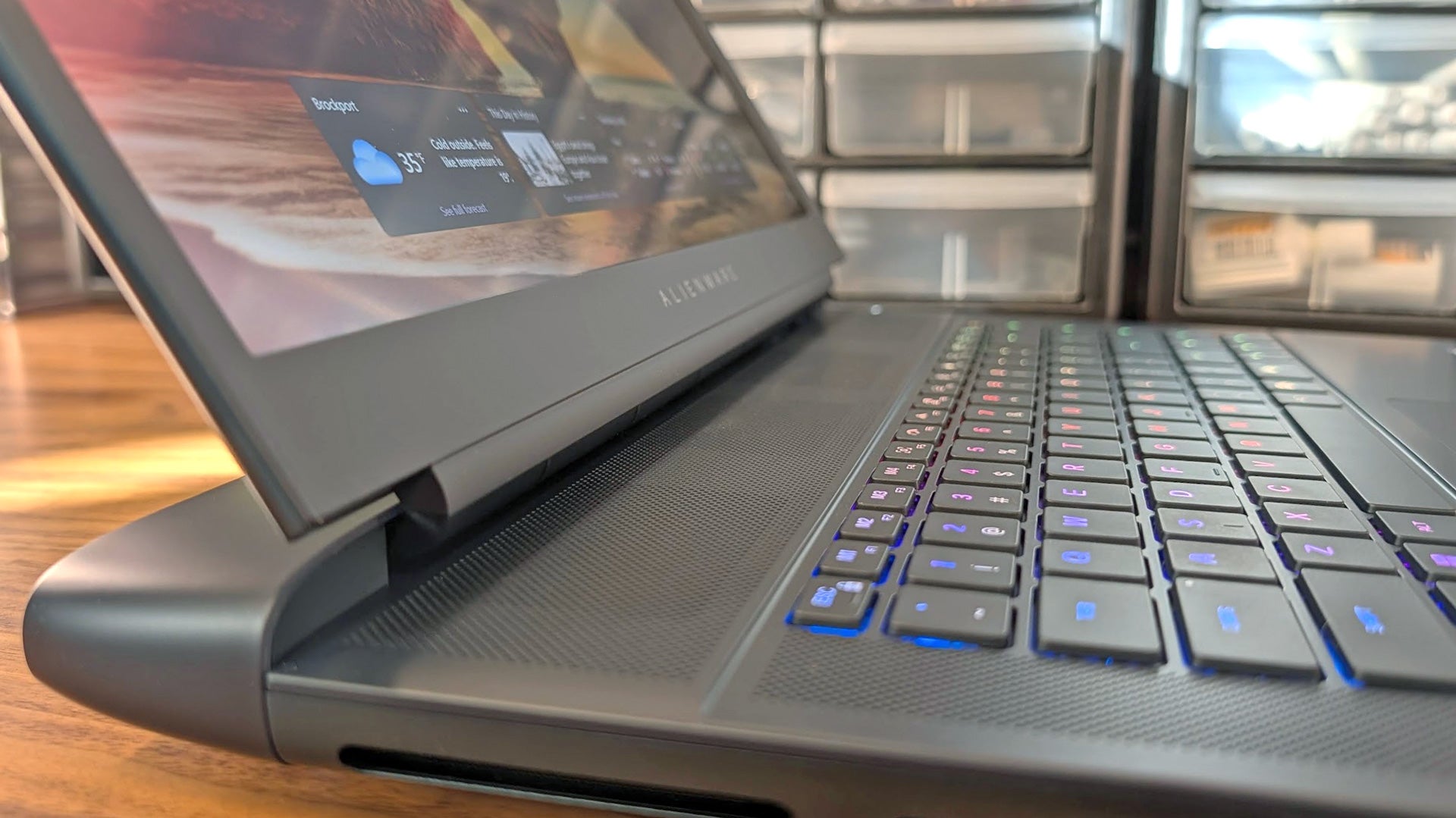 It comes with a generous port selection, so connecting peripherals or a docking station won’t be an issue. And I have to commend Alienware for making good use of its added thickness by putting most of that I/O around the back where it won’t get in the way of a mouse. There are three USB 3.2 Gen 1 Type-A ports, two Type-C Thunderbolt ports (version four for the RTX 5060 and RTX 5070 and Thunderbolt 5 for everything higher), and a full-size HDMI 2.1 video-out for connecting a monitor. Thunderbolt 5 is a major upgrade here, offering up to 80 Gbps of bi-directional bandwidth to support the highest resolution external monitors. The power brick also connects around the rear and uses a straight plug that doesn’t get in the way of other cables. The only other ports are on the left side. There, you’ll find an SD card reader and an audio combo jack.