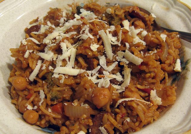 I added a cup of extra Jasmine rice and used half beef stock instead of all water, also I added: chopped Asian veggies, garbanzo beans, tons of seasonings, some dry Marjoram, three chopped cloves of garlic, a whole chopped onion, a chopped Seranno pepper, dashes of fish sauce, Sambal Olek, black soy sauce and Sriracha. Also thinly sliced and browned up a Cajun sausage with the oil and rice/vermicelli before adding the veggies and liquid.