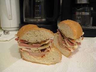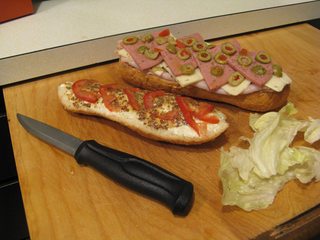 The dribbled-looking bit is some EVOO drizzled on with garlic pepper salt and dill. Yup, I V-cut the hoagie roll Subway style 'cuz I used to work at one many moons ago. It's effective.