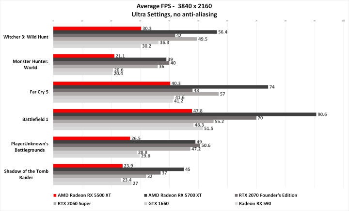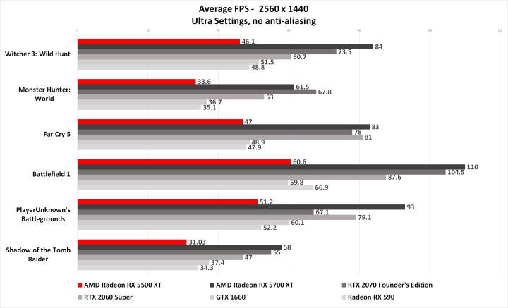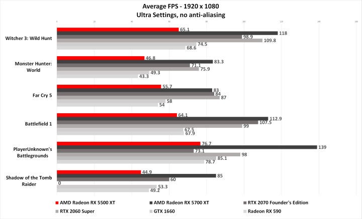 To test the performance of the card, I ran it through our stable of test games. Each game was set to the ultra presets or highest settings where that wasn’t possible and anti-aliasing was disabled. We are currently in the process of updating our test bench, so the 5500 XT, GTX 1660, and Radeon RX 590 were each tested in my personal system. It is currently running a Ryzen R7 3900X and 32GB of 3600MHz of G.Skill TridentZ Neo memory and free of any bottlenecks that would hinder performance.