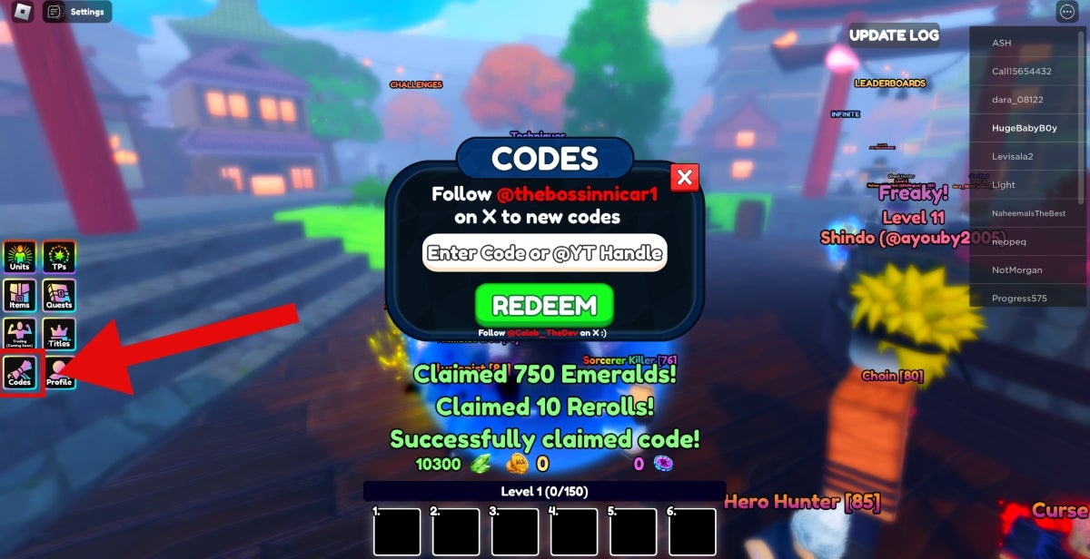You can redeem codes from the lobby in Anime Last Stand. When you're in the game, look at the tabs on the left-hand side of the screen. Amongst these, you'll see one labelled "Codes".