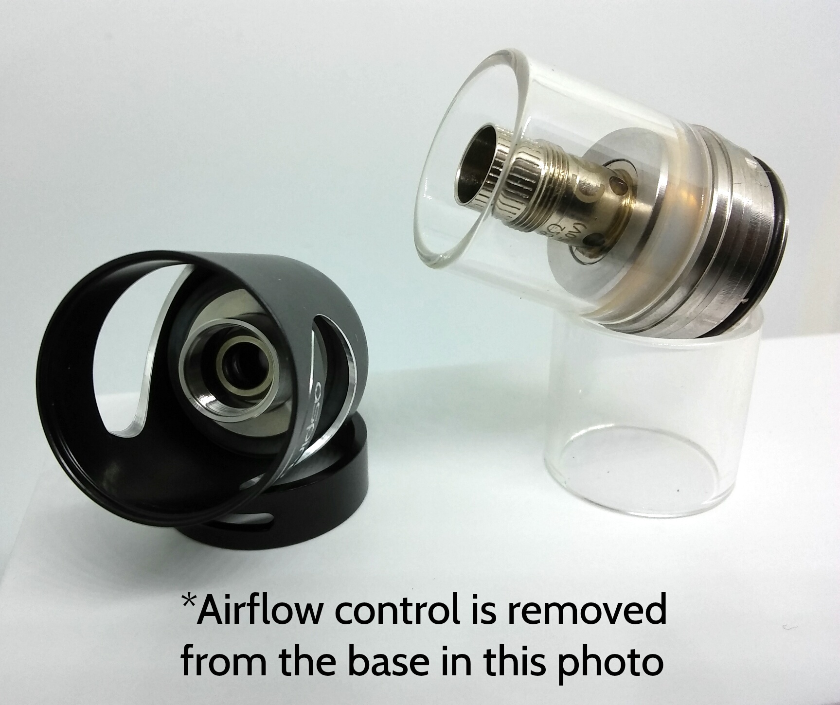 Moving on down, the airflow control is made up of 5 airholes that increase in size. You dont get to pick which size you want like you do on the originals. Instead, you turn the airflow control to reveal more air holes. You can have 1 open and get a downright amazing mtl draw, all 5 open for a restricted lung hit, and everything in between for fine tuning. In my opinion, you get a great mtl with 2 holes open or less, even though the airflow is pretty tight when full open. It's smooth as hell in all settings. The airflow control ring comes off for easy cleaning but stays in place nice and snugg thanks to an o-ring. You can adjust the airflow from closed to open while attached to a mod due to it opening clockwise. If you try and close it back down you'll just unscrew it from the mod. Thats a little irritating but it doesn't bother me too much because it would take away from the look.