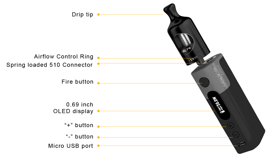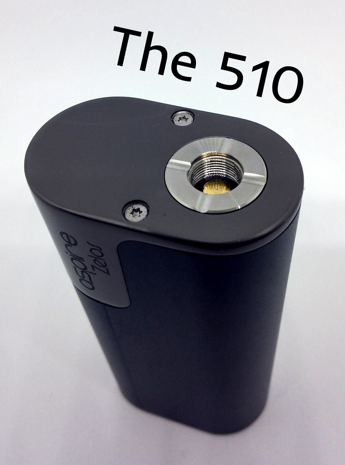 Now on to the Zelos 50w mod. Its nothing fancy. Aspire claims it does accurate TC on nickel, titanium and stainless. You get VW of course, and surprisingly you get variable voltage and a bypass mode. I love mods with bypass modes btw. The Zelos is very ergonomic to hold and is very light weight. It fits inside the palm of my hand easily. All the buttons are super clicky and I can't hear any rattle when I shake the shit out of it. It's two toned with the main color being the exact same as the included tank, right down to the pebble texture I mentioned earlier. The second color appears to be painted with the engraving showing the raw material beneath. If your hands are dry this thing is damn slick! I've dropped it once already and about died!