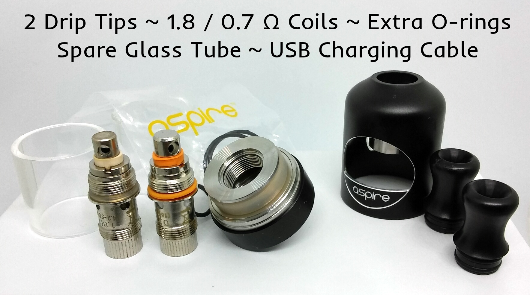 I want to start with the star of the show, the Nautilus 2. It's very sleek and silky, with a nice pebble texture on the main color. Aspire went back to basics, back to what worked on the first 2 tanks and made it better. I can't lie...it's the bomb. You can use the same BVC coils that we all love (1.6 & 1.8 Ω) and they've added in a new coil that's 0.7 Ω (18 - 23 watts recommended). The new coil looks exactly like the other BVC's; Appears to be the same inner diameter of coil as well, but the 0.7's have way more airflow. You can totally tell the difference. They also color coded this coil with an orange o-ring so it's easy to tell them apart