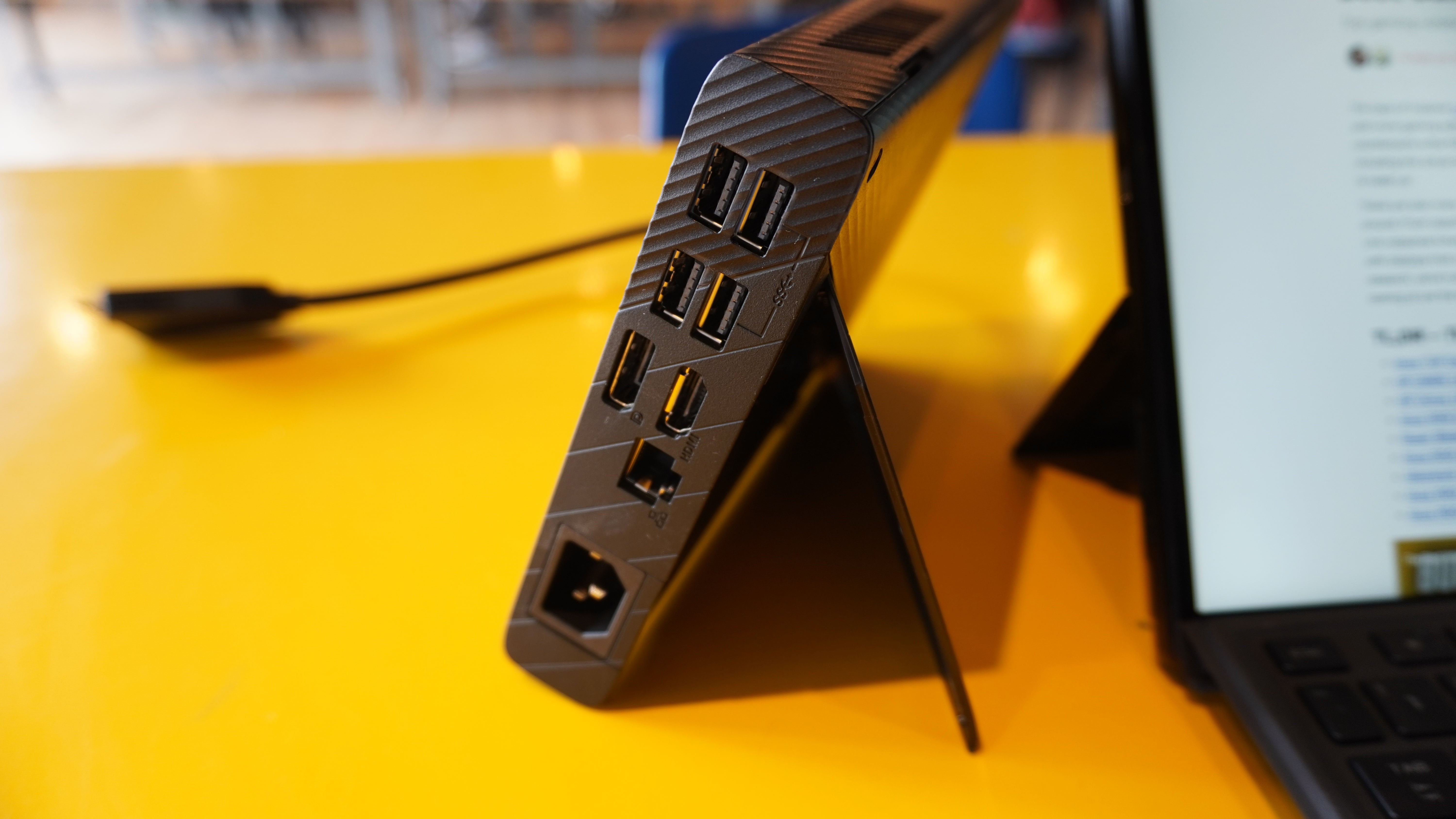 The XG Mobile connector is chunky and locks in place, but the length of the connector is a concern, as it presents an opportunity to apply a lot of leverage on the connection, which could make for an easily broken link. When docked the connector handles power delivery, leaving the Thunderbolt 4 port free for whatever else you might want. The dock also provides the ROG Flow Z13 with a bunch of extra ports. There are four USB ports as well as HDMI, DisplayPort, and Ethernet connectors. There’s even a full-size SD card reader. The XG Mobile is kind of like a double-wide power brick. Most gaming laptops have pretty substantial power bricks, and this is just a little extra. The graphics processor is inside alongside cooling hardware. The XG Mobile also includes a kickstand to stand it up and ensure good airflow, though intake vents on two sides should make it hard to accidentally choke the device. The XG Mobile can come with an RTX 3080, though in reviewer materials Asus has mentioned RTX 3080 Ti and AMD Radeon RX 6850M XT as options. Portability takes a hit once the XG Mobile is factored in, which brings the total package weight up to 5.78 pounds.