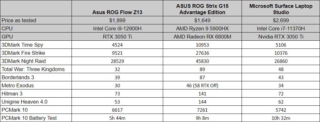 The RTX 3050 Ti in the system I tested has enough might to hold up to some gaming on the go. It can handle a number of games at 1080p and max settings while maintaining averages above 30fps, including Metro Exodus with RTX enabled. Of course, for $1,899, you can get a much faster gaming laptop (albeit a heavier one). The Asus ROG Strix G15 Advantage Edition costs less and easily muscles out the ROG Flow Z13 with double to triple the benchmark scores and more battery life to boot – of course, it weighs almost twice as much, too. The 4.2-pound Asus ROG Zephyrus G15 stacks up better at $1799 for a model with a Ryzen 9 5900HS and RTX 3070, and I’d absolutely recommend it instead.