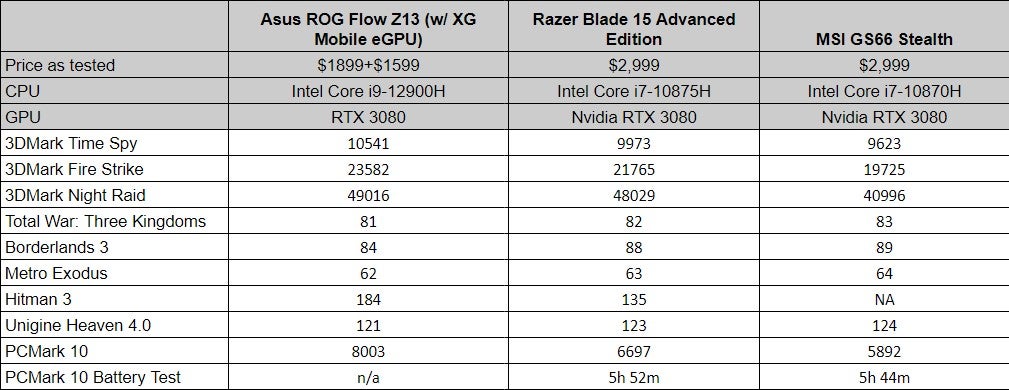 The Asus ROG Flow Z13 we tested is available from Best Buy for $1,899 as a standalone 2-in-1 laptop. Asus also sells a $1,799 model with a Core i7-12700H, 512GB of storage, and an RTX 3050 on Amazon and Newegg. The XG Mobile eGPU comes in a $3,299 bundle with a model similar to what we’ve tested except it has a 3840x2400 UHD 60Hz display.