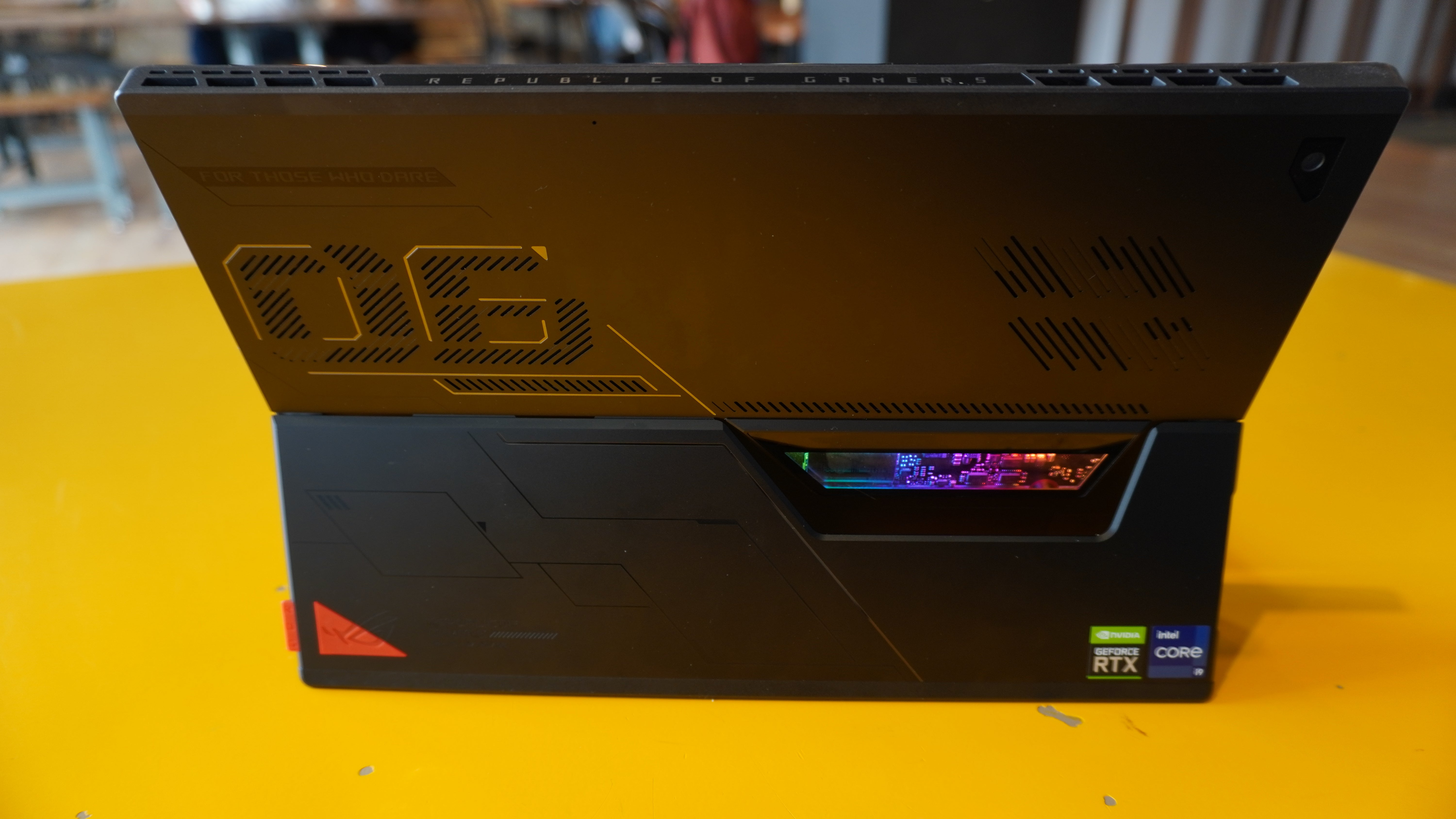 The tablet has a robust, aluminum frame that’s thoroughly stylized with cut-outs, etching, and logos. By far the slickest choice by Asus is the transparent window on the back that shows off some PCB on the inside of the device illuminated by RGB lights.