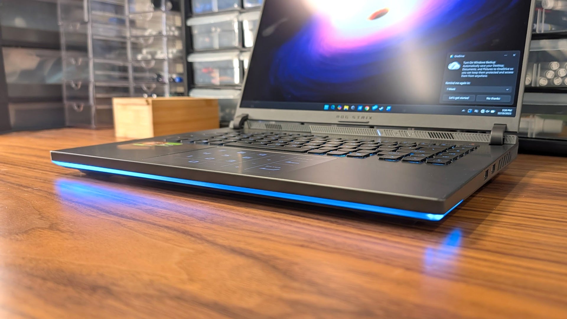 The AMD system I’m reviewing comes with two USB 3.2 Type-A ports, two Type-C USB 4 ports, a full-size HDMI 2.1 video out, an RJ45 ethernet jack, and a 3.5mm audio combo port. Only one of the USB 4 ports can be used for charging, unlike the Intel version, and both Type-A ports are on the right side, which can get in the way of the mouse with trailing wires or larger dongles.