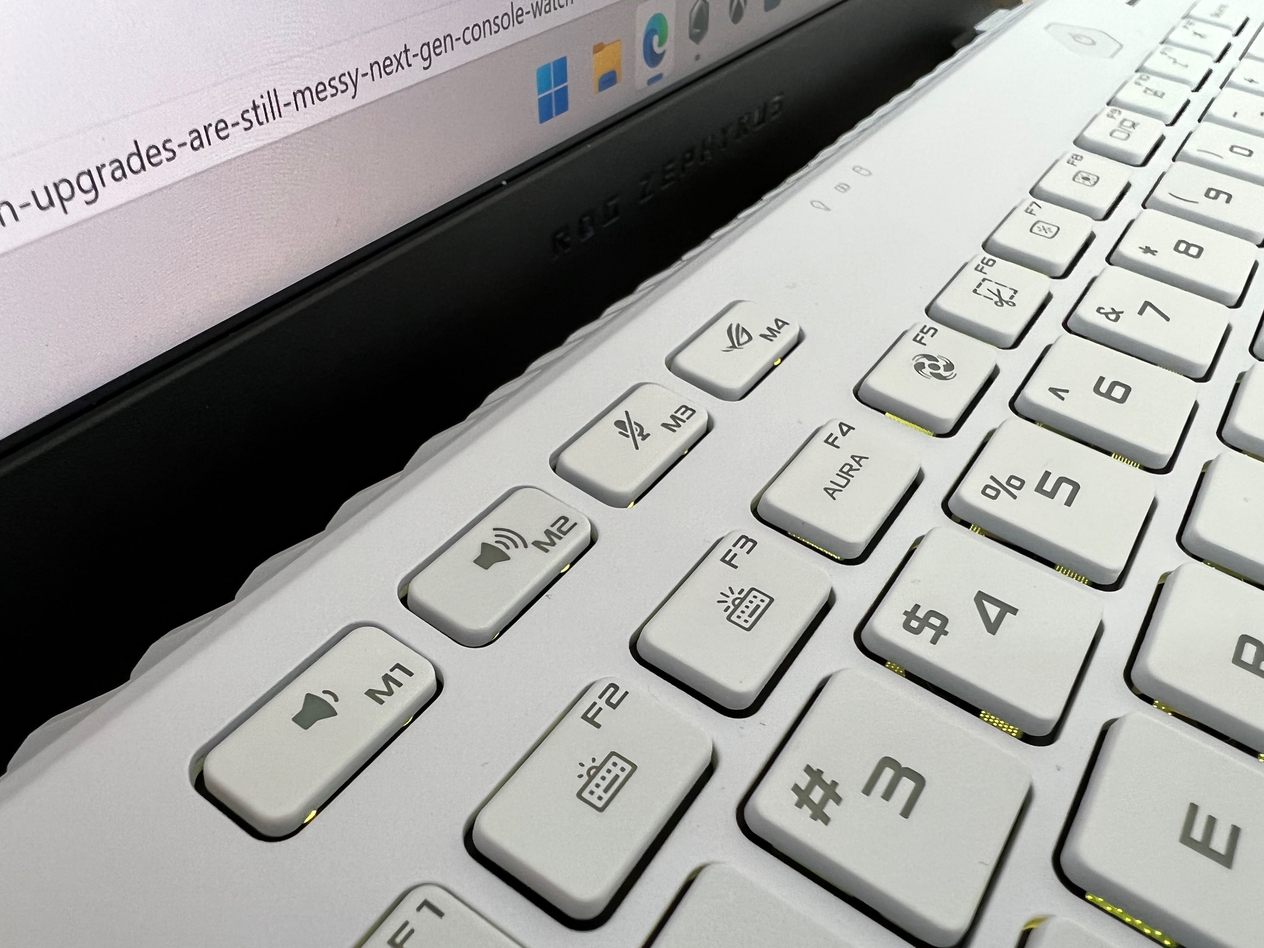 When you open the lid, you're greeted with an RGB backlit chiclet keyboard with white keys. On the left side of the deck above the keyboard are three keys dedicated to volume control, and another that launches Armoury Crate app, though all four can be programmed to your preferred actions. To the right of those keys is the power button.
