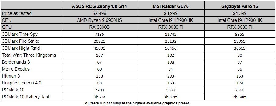 The MSI Raider GE76 lasted 3 hours and 37 minutes while the Gigabyte Aero 16 lasted 2 hours and 58 minutes in the same exact test. Yea, the Zephrus G14 is a battery life champ.