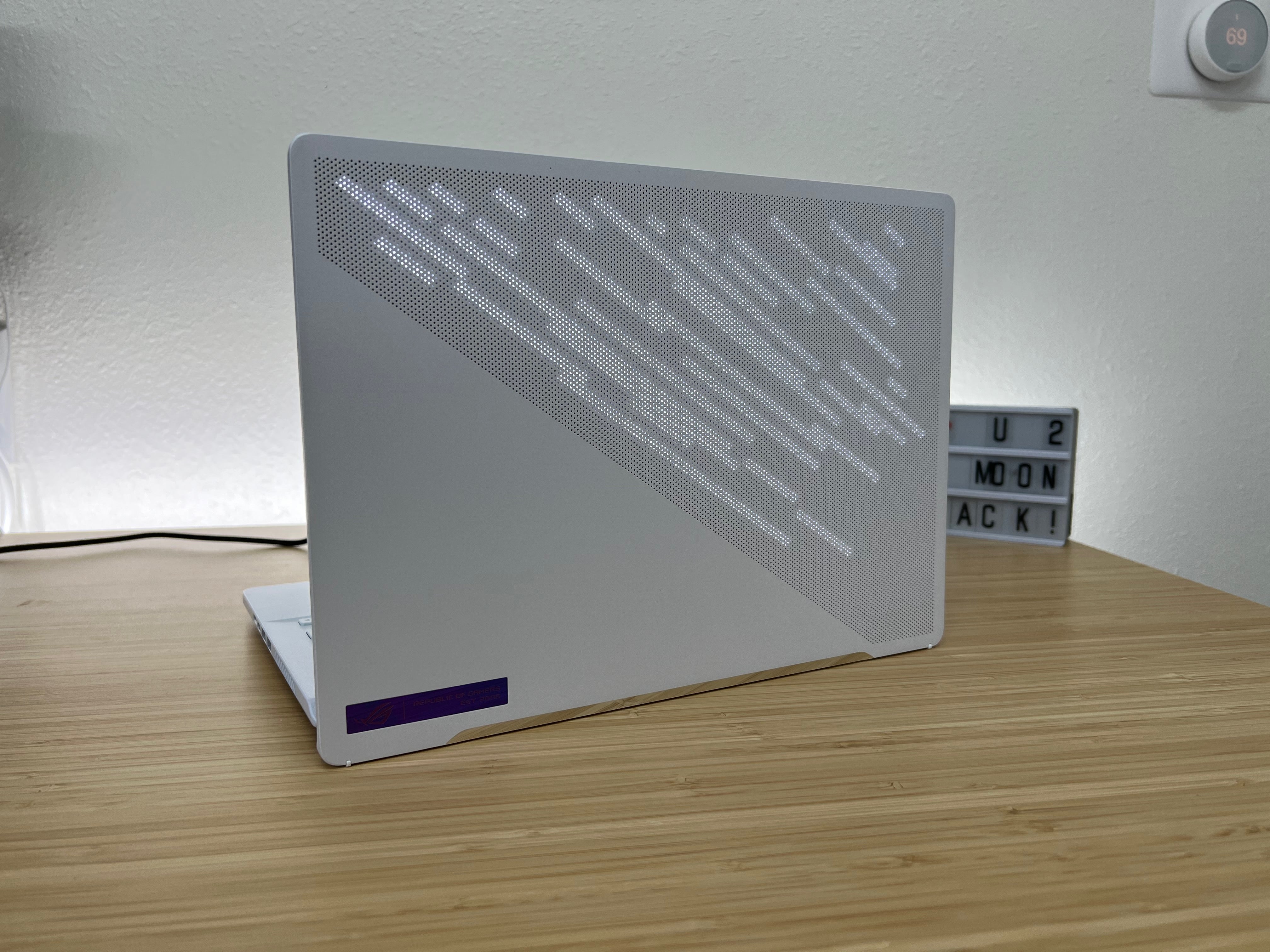 When I first unboxed the G14, I wasn't overly impressed. I wasn't turned off by it, mind you, but the basic white housing with what appears to be a stipple effect on the lid has been done before. However, once I turned it on and I heard my kid yell WHOAAAA from across the room I grew to appreciate the design. You see, on the lid of the G14 is an Anime Matrix that has 1,449 mini-LEDs behind 14,969 individual holes that light up and are constantly in motion.