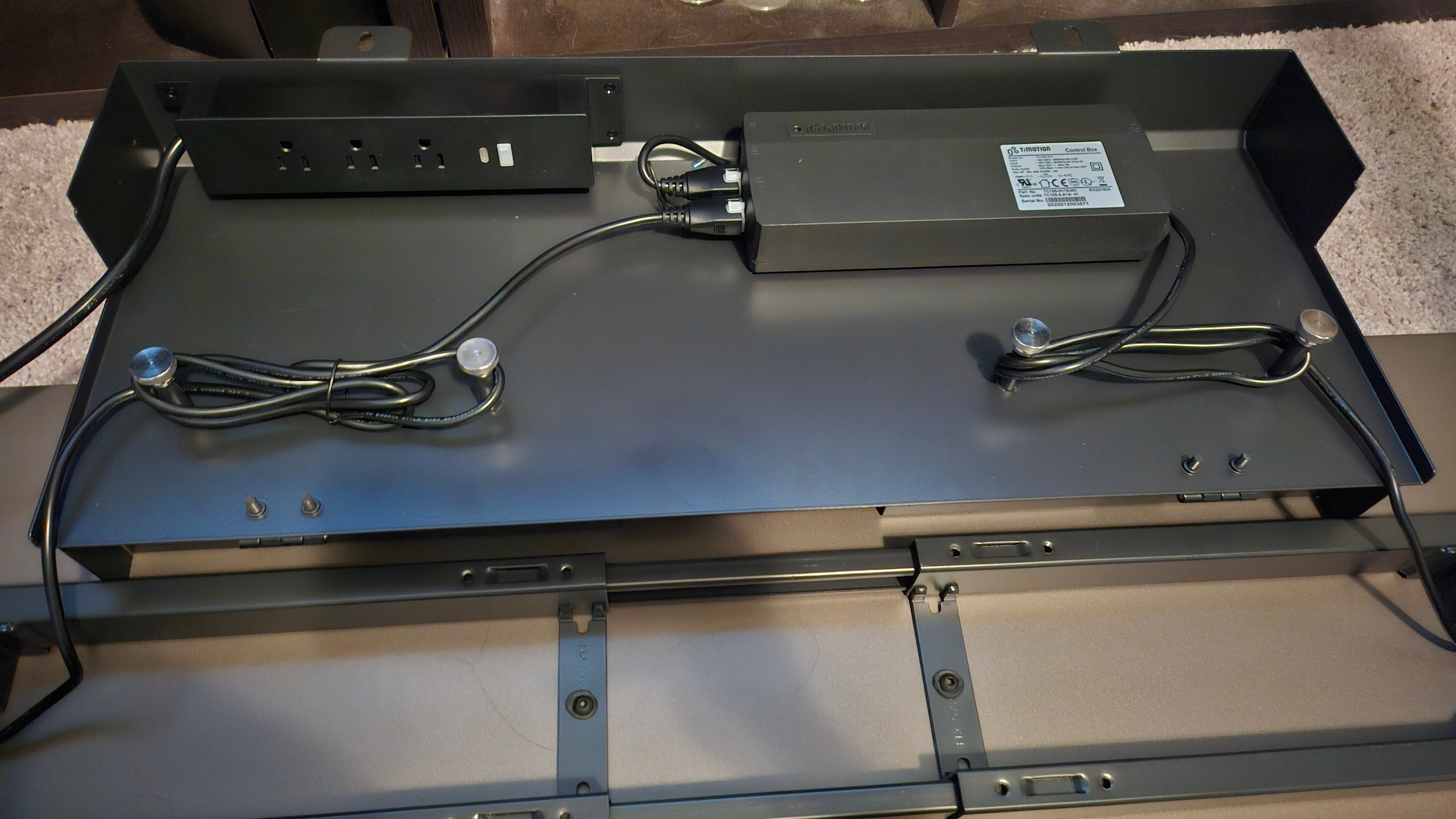 The cable management system is where the Autonomous SmartDesk 5 Pro really shines. Under the desk surface, there is a built-in hook and cable tray that swings down when open and is held in place by two bolts. When you open it and let it swing back, the Autonomous SmartDesk 5 Pro has a space dedicated to hold the desk’s power brick and a surge protector. But what’s smart about this design is the addition of metal dowels that allow you to wrap cords around to tuck them neatly into place. When you’re done organizing, you’ll just pull it back up and bolt it shut – all doable with your hands.