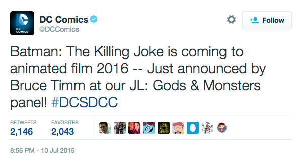 An animated movie of Batman: The Killing Joke is coming next year, DC Comics' Bruce Timm announced during the "Justice League: Gods and Monsters" panel at San Diego Comic-Con.