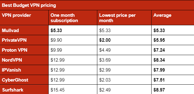 If you’re looking to use a VPN month-to-month, you’ll find that Mullvad is by far the most affordable. Yet PrivateVPN works out 62 percent cheaper per month if you opt for its three year subscription deal.