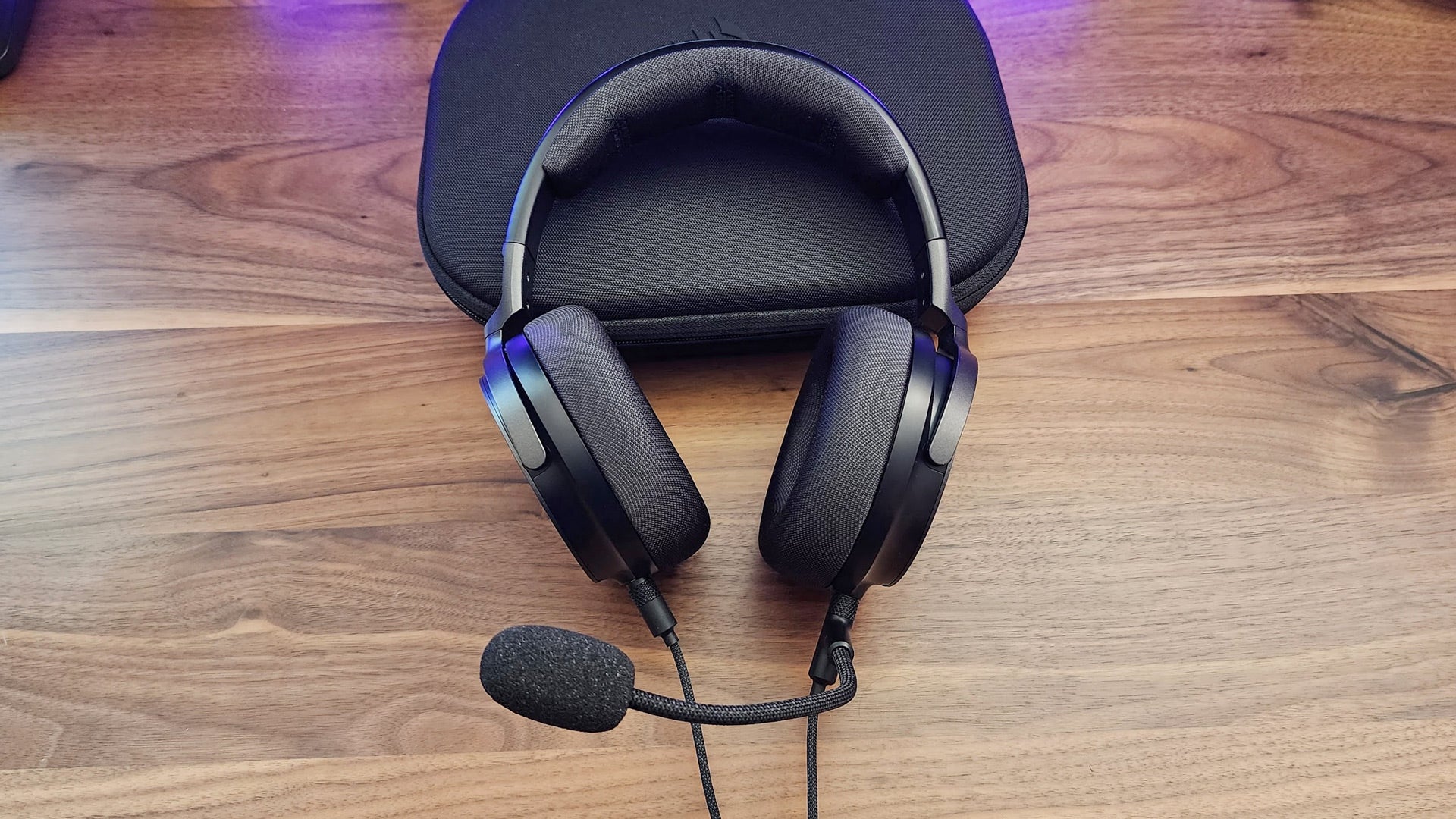 In the mesh pocket on the top of the case, you’ll find three detachable audio cables with a fourth available as an optional purchase from Corsair. For gaming and streaming, the mic cable adds a flexible unidirectional mic to the left earcup. When you don’t need a mic, or have a separate one on your desk, there’s a standard 3.5mm cable. A splitter cable is also included if you want to break out the microphone and headphone connections. For dedicated listening setups, Corsair also sells a 4.4mm balanced cable to connect to higher-end DACs and amps, but since these headphones don’t require much power to drive, it’s not a must-have purchase.