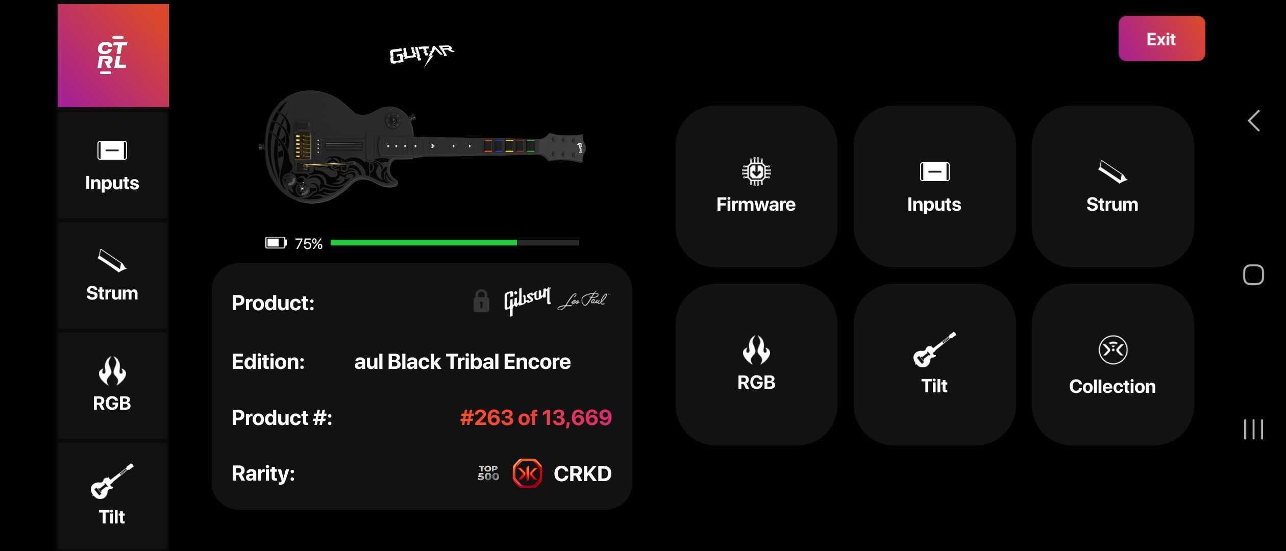 The CRKD Gibson Les Paul controllers are extremely customizable, and most of that customization is done through the CRKD mobile app. When you set it up for the first time, you’ll need to pair the guitar to the app by scanning an NFC point on the back of the guitar. This process will reveal a unique serial number and a ‘rarity’ rating, if you care about that kind of thing.