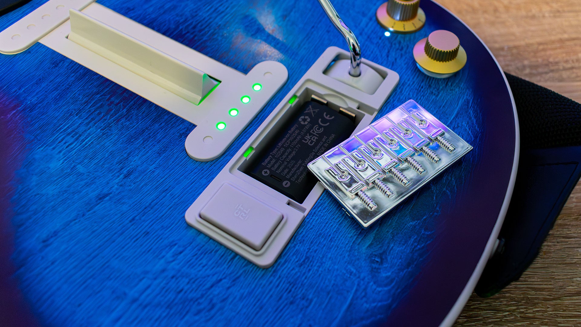 Out of the box, the dongle is tucked away in a compartment next to the strum bar. Just slide it out of place, and it’ll be there ready for you, then, you can just put it back when you’re done with it. But that’s not the only secret compartment. On the other side of the strum bar there’s another panel that you can slide off to reveal a removable and rechargeable battery. This is awesome, as it means you don’t have to worry about buying a new guitar when the battery eventually dies, you can just swap it out.