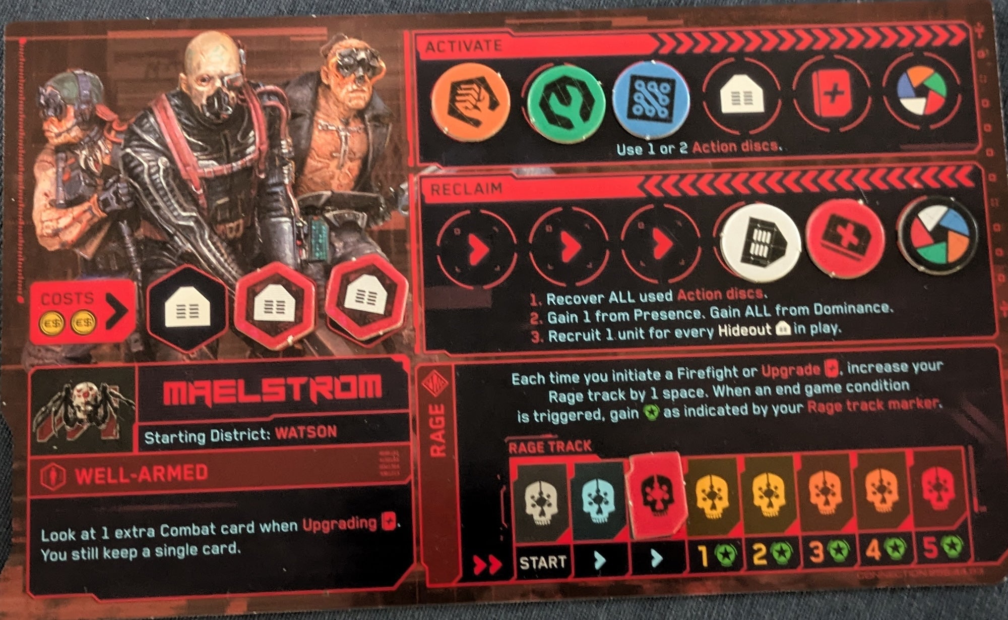 While anyone with even a minor amount of experience with strategy board games will readily understand this game’s processes, there is a somewhat tricky learning curve. This is due to the difficulty in parsing the unit types and their associated behavior. Each figure type is denoted by the shape of its base. This isn’t difficult, but it can be confusing to pair the unit types with the action discs and the connected Points of Interest on the map. These POIs are special sub-spaces within each district on the board. Gangs will control these positions with a figure, and they function as either a requirement to purchase an Edgerunner and complete an Opportunity, or they provide bonus resources when you netrun. This confounds new players as they struggle to keep these details straight. After a play or two these quirks will be internalized, but this idiosyncratic triangulation of symbology feels a little inelegant in an otherwise smooth design.