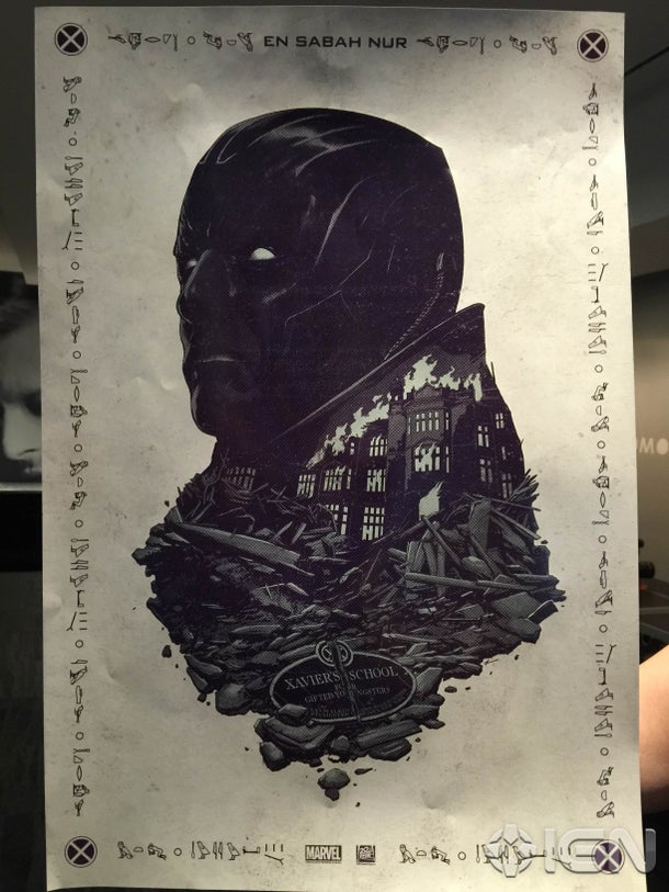 The print also incorporates hieroglyphics and Apocalypse's birth name – En Sabah Nur, which was fictionally translated in the comics as 'The First One' – to reflect his Egyptian heritage. The imagery also implies that the Xavier's School for Gifted Youngsters will come under attack in the film.