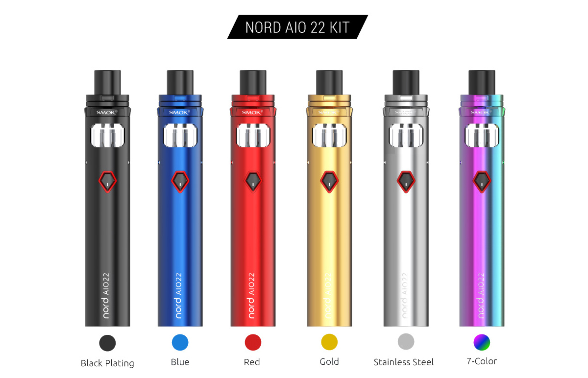Smok Nord AIO 22 Starter Kit is also a new all-in-one starter kit that has different diameter from Nord AIO 19 Kit. They have similar appearance with each other, but Nord AIO 22 kit is more powerful. It has 2000mAh built-in battery capacity and has a 3.5ml built-in glass tank.