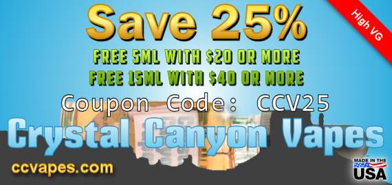 May savings with 25% off all of Crystal Canyon Vapes USA crafted eliquid! Coupon code: CCV25