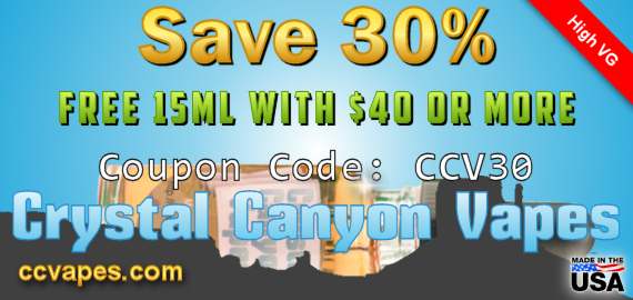 May savings with 30% off all of Crystal Canyon Vapes USA crafted eliquid! Coupon code: CCV30