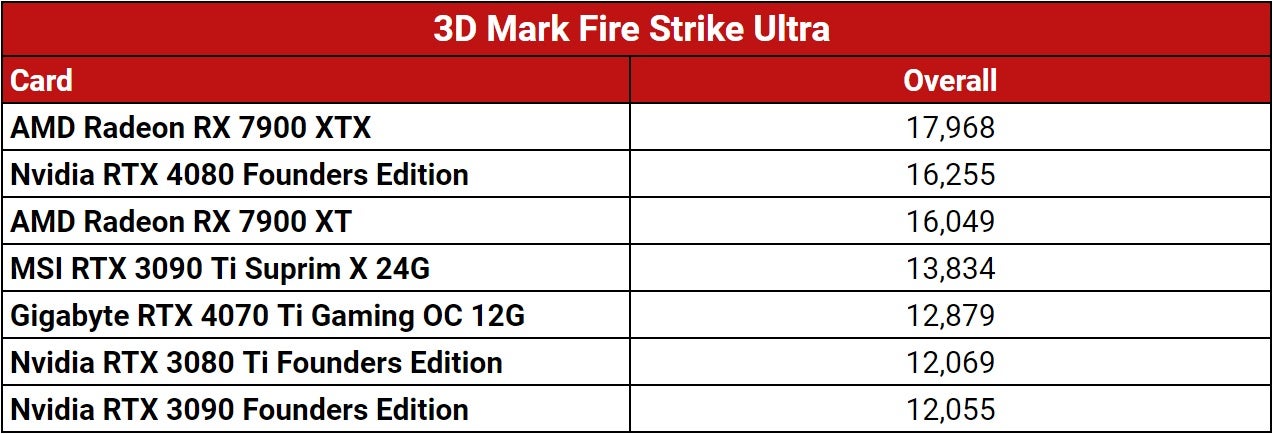 Starting with 3DMark Fire Strike Ultra, the RTX 4070 Ti delivers respectable results. It lands smack in the middle between the RTX 3090 Ti and the RTX 3080 Ti. The RTX 4080 and AMD’s RX 7900 XT and 7900 XTX all outperform it by a significant margin, but each is also substantially more expensive, so this is to be expected.