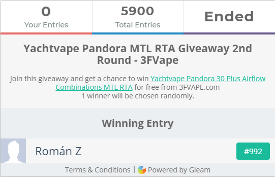 It's a great honor to be here to publish the final result of the Original Yachtvape Pandora 30 Plus Airflow Combinations MTL RTA giveaway.