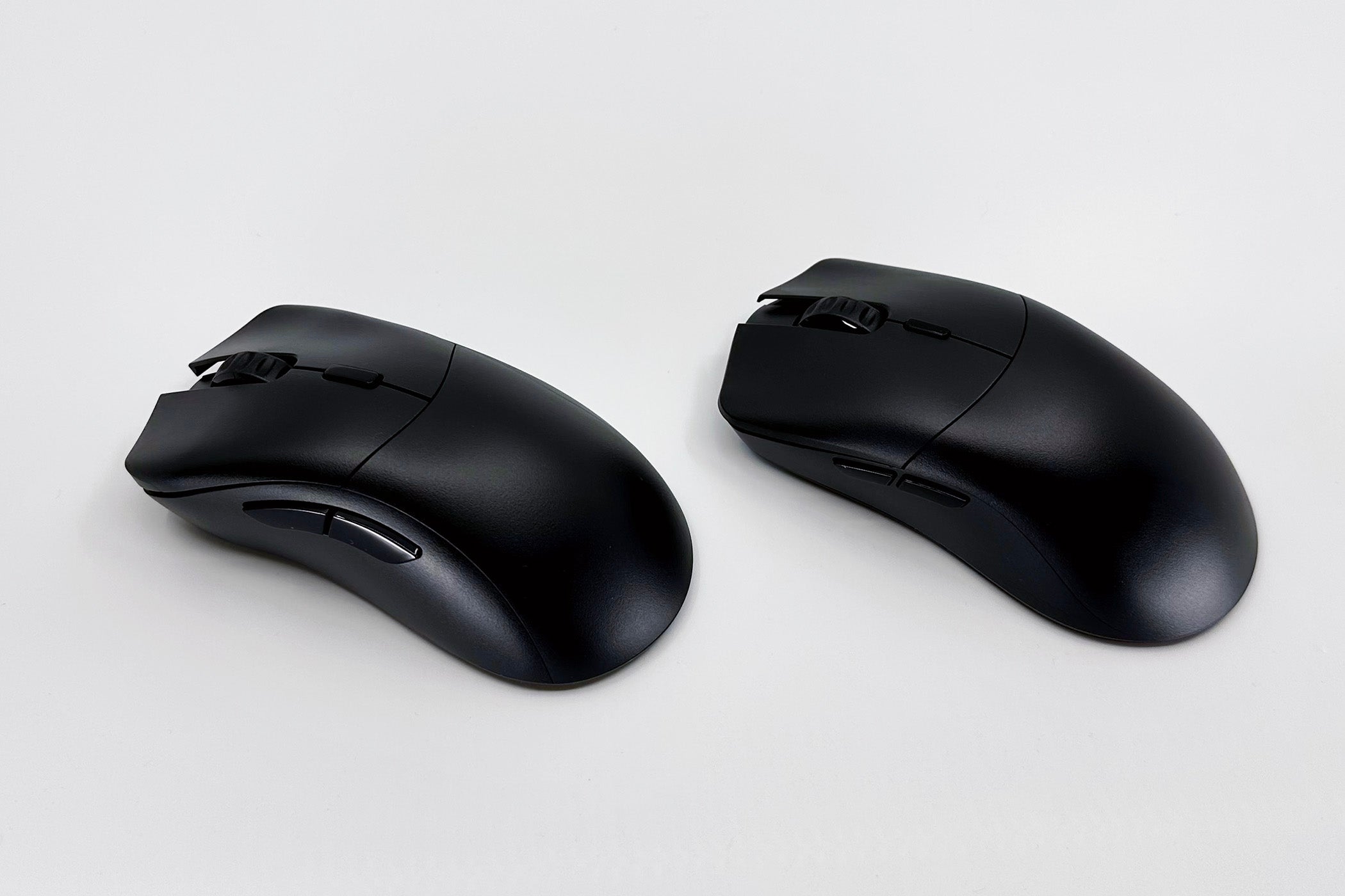 The Model O 2 Pro, on the other hand, has a leaner and more symmetrical shape, with a design reminiscent of the Logitech G Pro X Superlight, just with a touch more outward flare at the top and bottom. It's what would be considered an ambidextrous mouse, although the two buttons on the left side are typically meant to be accessed by a right-hander's thumb. This shape is suitable not only for a palm or claw grip like the D 2 Pro, but also a fingertip grip, should that be your preference.