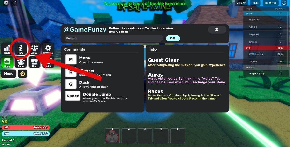 To redeem codes in Grimoires Era, first boot up the game and enter a lobby. From here, you'll see some tabs on the left-hand side of the screen. Click the Info tab and a menu will appear. At the top of this menu, you'll see a box below the developers' twitter handle where you can input codes. If the code you input is successful, you'll see green text appear at the top of the screen with the rewards that have been added to your account. If the code you input is unsuccessful, you'll receive red text telling you the code is invalid.