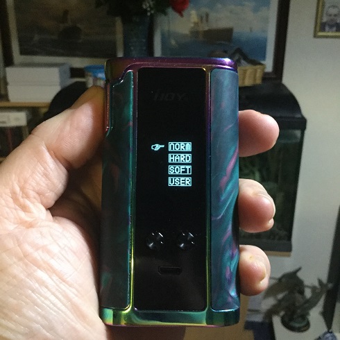 The Captain Resin comes in standard cardboard packaging and the first thing i noticed was just how nice and good quality the Resin sides of the device look. The device is very substantial in size allowing for large tanks to be fitted even though the 510 isn't centre mounted. Despite it's chunky size and boxed appearance the edges have nice ergonomic curves so it's comfortable to hold and i like the position, shape and size of the fire button, some people might find the device too heavy for their liking but others will like that solid substantial feel. I received the Rainbow Splendor version, the Rainbow refers to the colour of the metallic chassis while Splendor is the Resin design, the options are, Black Ghostfire, Rainbow Splendor and Gunmetal Hellfire. The front of the device has a vertical elongated rectangular Black panel central. This panel has "IJOY" printed at the top, underneath we have the 0.96 OLED screen housed, further down are the navigational buttons followed by the micro USB port at the bottom. The back of the device has the same shaped panel as the front in the same central position, this panel has "Captain Resin" printed and is somewhat of a fingerprint magnet. One side of the device is featureless, the other side has a large almost square fire button, the bottom of the Captain is the battery door which has printed branding and safety stamps. Moving to the top we have a spring loaded, Gold plated 510 placed to one side. The device is solid with no rattles and the Resin does look extremely nice (see pics) however it's not real Resin (see mini rant section).