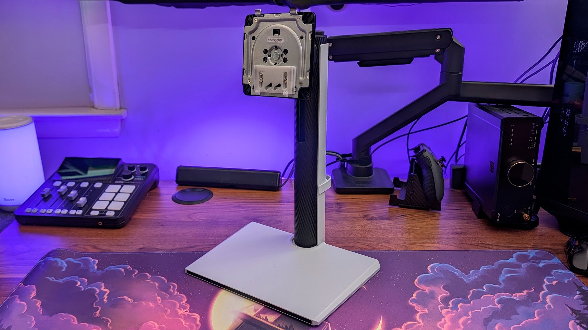In practice, that means you're not sacrificing anything for its comparatively lower cost. It comes with 5 inches of height adjustment, 45° of swivel, -5° to +20° of tilt, and can be rotated into portrait orientation to act as a second monitor. Stylistically, its white color and contoured design reminds me a lot of Alienware’s monitors. Instead of the usual tripod base, it uses a large flat plate that, while it does take up additional desk space, is slim and low profile enough that it's easy to put just about anything on top of it. So it doesn't meaningfully limit anything with this design. It looks good and doesn’t hint at all toward the monitor’s affordability.