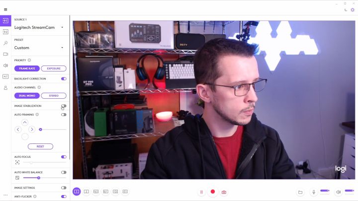 Apart from its look, Logitech has made a number of enhancements to the camera itself. The aperture has been lowered to f2.0, which is almost a full stop below the C922’s f2.8. The camera’s sensor is still too small to offer the same bokeh you could expect from a nice camera and lens, but that doesn’t mean it’s pointless. A larger aperture means it can take in more light and offer better performance in dark settings. The StreamCam is flexible in how it can be set up. The mount that comes pre-attached allows you to position it on the top of your monitor like normal, but it can also be unclipped and rotated to capture vertical video. It’s a neat feature that no other webcam I know of is capable of, and makes the StreamCam more versatile – but I’m left wondering who it’s for. Most streamers don’t use vertical video at all, and for social media applications like Facebook Stories, very few people use anything other than a smartphone. Much more useful is the second mount Logitech included, which allows you to attach the StreamCam to a tripod. To make use of the StreamCam’s 60 fps at 1080p, you’ll need a USB 3.0 connection. This was a major issue when the Brio launched and led to many people connecting their webcams incorrectly. The StreamCam side-steps that problem by ending its cable in a USB Type-C connection. If you’re connecting over Type-C, there’s no way to connect it “wrong,” but if you’re using a PC that’s a few years old, you may not have a Type-C port at all. Logitech recommends using an adapter in this situation, but doesn’t include one in the box, which feels awfully stingy for a product that costs $169. It’s also not common for webcams to require USB-C, so there’s a good chance some streamers will buy the StreamCam only to find out they can’t use it. Using Logitech Capture, the camera is able to offer a couple of neat tricks others don’t, including Image Stabilization and Auto Framing. Image Stabilization is a head-scratcher. Most webcams are set in one place and rarely move. They don’t need image stabilization. Turning it on causes the camera to zoom in to hide the shaky edges and still didn’t eliminate jostling when I bumped the desk. In my case, it just wasn’t worth the reduced field of view to leave turned on. Auto Framing is more interesting but feels a little gimmicky. The StreamCam offers the best face tracking I’ve seen on a webcam and uses that to follow you as you move around the frame. It works remarkably well and was able to move the frame to follow me anywhere I moved in its 78-degree field of view. It desperately needs a sensitivity slider, however, because the mix of pan, tilt, and zoom moved too much to be useful instead of silly as I would lean in my chair. I can see the benefit if you move from place to place in a stream, though. Another problem is that the camera doesn’t do this natively, so using it with OBS or XSplit involves leaving Logitech Capture open in the background. The program is lightweight, but if your system is already near its limit, it’s not something you’ll want to leave running. The rest of the software feels like it’s still in a beta state. You can choose between Streaming and Recording settings, which trades off frame rate for exposure. The Streaming setting didn’t feel well-tuned, and left my image darker than if I dialed in settings myself. Under the Image Settings tab, you can tweak brightness, contrast, and sharpening (and will need to for the best results) but the sliders are both too small and don’t update until you let go of the mouse. What should be a simple slide requires lots of clicks. After seeing how everything worked, I went back to the sliders built into OBS because they felt much more functional.