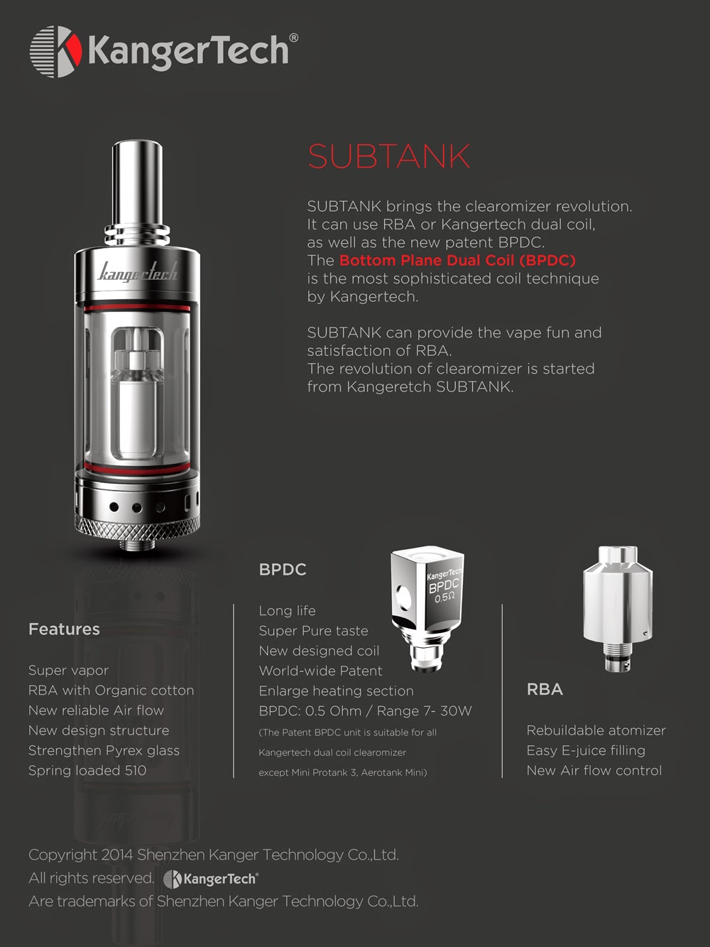 The revolutionary Subtank hybrid, A first of its kind. Giving you the freedom to switch between Kanger’s newly designed Bottom Plane Dual Coil heads (BPDC) and a new rebuildable atomizer head. With just a few twists, you can switch from a convenient vaping experience to getting down and dirty by making your own coils and choosing your own wicks to your pleasure.