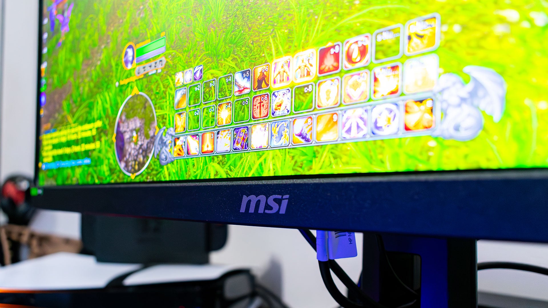 The bezels are reasonable, measuring in at about 0.7 inches by my own measurements, though there is a larger bezel on the bottom where you’ll find the logo. Turn the monitor around, however, and it’s very clear that this is a capital-G gaming monitor. Just like many other MSI devices, this monitor is emblazoned by a dragon on the back, and has a surprisingly modest RGB light strip on the opposite end.