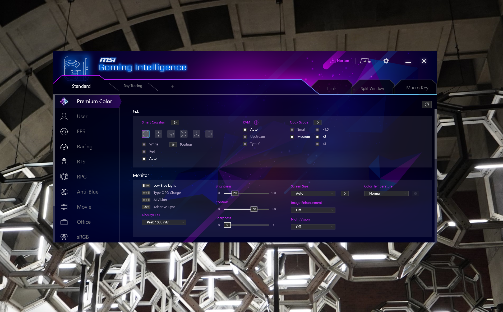 Since the rear compartment that houses most of the electronics of the monitor doesn’t extend to the sides, MSI fit the controls near the center of the monitor, just below the panel. These include a convenient joystick for navigating menus, a power button, and a macro button that by default launches the MSI Intelligence Center app. Annoyingly, if you want to change what the macro button does, you’ll need to install said app to change it. The app will try to install itself when the monitor is connected over USB-C or USB-B to a computer, and it will try to bring Norton antivirus along with it if you aren’t judicious during the installation process.