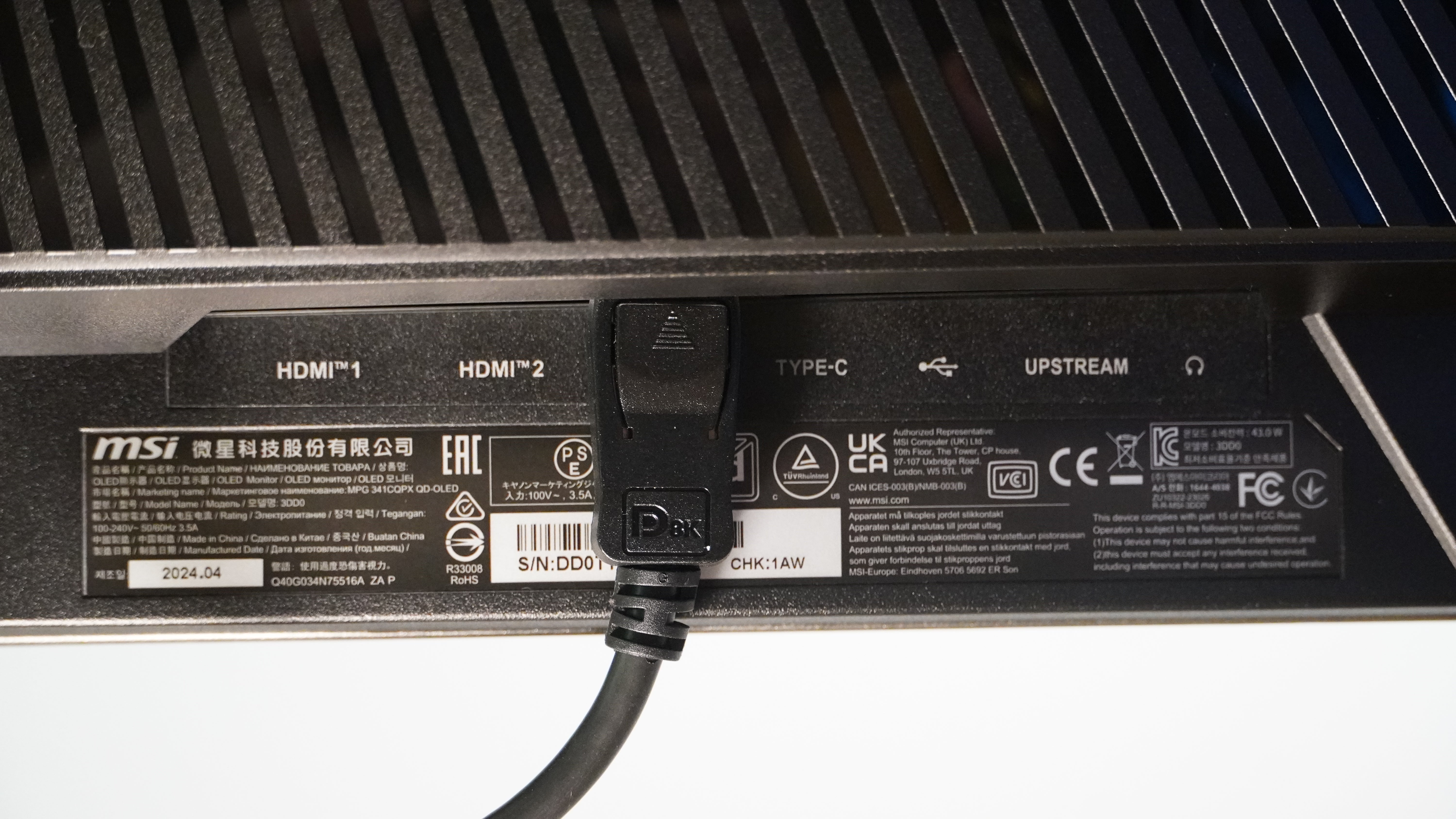 The MSI MPG 341CQPX QD-OLED sits on a minimalistic stand with thin metal legs that reach out a long ways in the front and stick out just a touch in the back. The stand offers just a modest degree of height adjustment (100mm) and vertical tilt (25 degrees in all), but it has a good range of rotation (30 degrees in either direction), so you can effectively point the monitor one way and the legs another. The neck of the stand has a gap for conveniently routing cables through, though there’s no fully hiding the cables as they come straight down from the display and can’t bend sharply enough to hide. The stand keeps the monitor largely stable, but does have a little wiggle to it.