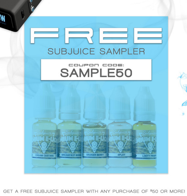 Condensation Silver Contributor Member For 4 Years Member For 3 Years Member For 2 Years Member For 1 Year Member For 5 Years Feb 11, 2016 #1 Free Subjuice Sample Pack With $50 Order coupon sample50 OFFER VALID UNTIL 2/15