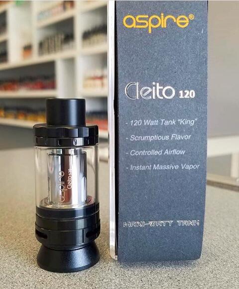 Aspire Cleito 120 Atomizer features "Maxi-Watt" tank under high-power vaping, which can ramp up to 120 watts and enjoy smooth airflow, intense flavor and gigantic vapor production. It adopts stainless steel and pyrex glass construction, top fill and bottom airflow, 25mm diameter and 4ml ejuice capacity.
