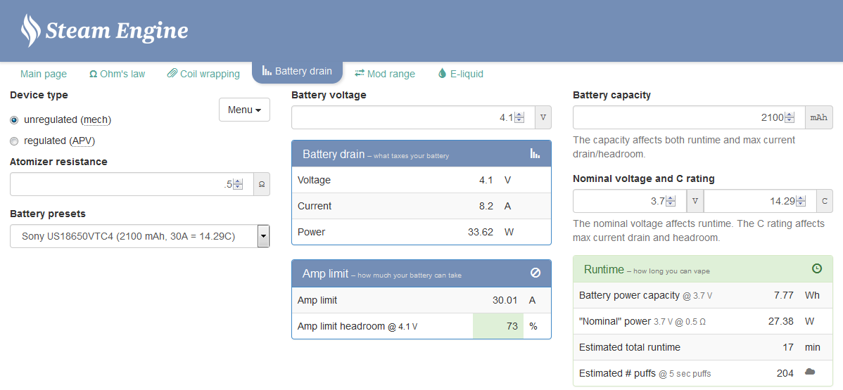 Take the Sony VTC4 for example. I used a resistance of 0.5ohms and a voltage of 4.1volts charged on this page. The page tells you how many amps you are pushing along with the wattage output. The amp limit is advertised to be 30amps and the box under shows the “headroom” or I like to call it the buffer. In this example you only use 8.2amps, this is safe for the battery. You really shouldn't use all the battery's amperage on an unregulated mechanical, it's not very safe. A lot of people agree on only using about 75% of the batteries amp limit, leaving a 25% headroom to be considered safe. This works out to be about 22amps used and around 0.18-0.19ohms. You should only do this if you are aware of the risks.