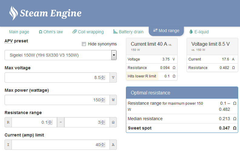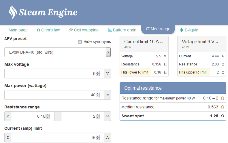 The last box “Optimal resistance” sums it all up by giving you the resistance range along with the median resistance. Then it gives you a “sweet spot”. This is the median from the first median and the maximum. If you want all 40 watts and want to keep your battery life in good shape use a resistance around the “sweet spot”. You don't have to use the sweet spot, but keep in mind the less amps you pull, the more battery life you get while taking advantage of the device's voltage.
