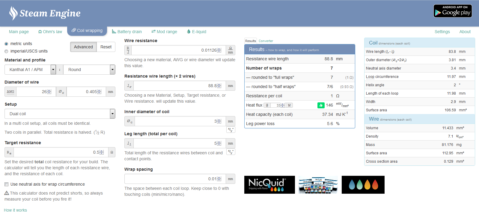 I used a 0.5ohm resistance, selected the kanthal of choice, selected dual coils, and selected the coil's internal diameter. I also calculated the wattage with 0.5ohms and 4.1volts to get around 33 watts to plug into the heat flux(under results) to get an estimate of the vape temperature.