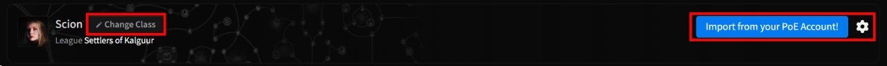 Getting started is straightforward; you can either select your ascendancy on the left to begin making a planner from scratch or link your Path of Exile account to import a character directly using the large blue button on the right. The gear on the right side is also where you go to save a profile.
