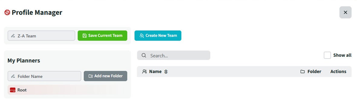 To save a team, first give it a name by entering something into the box containing the words 'Name your Team'. Once you're happy, select 'Save Current Team'. This will automatically save your team into the folder you've currently got selected.