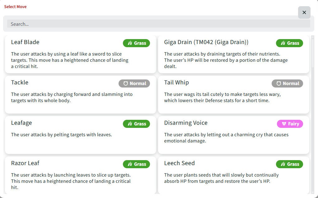 Adding Pokémon's Moves is quite easy. Simply select the 'Add Move' button beneath the 'Move' subheading on the right-hand side of the page. This will open up a menu of all the moves this Pokémon can use in your chosen game. Here you can either search for a specific move or simply scroll down the menu. The moves a Pokémon can learn from TMs will also be available!
