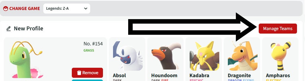 Next, click the 'Manage Teams' button which can be found above the Pokémon you've entered for your team. Here you'll be able to name your current team, save it, create folders to organize your various teams in and be able to create new teams too.